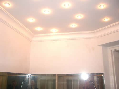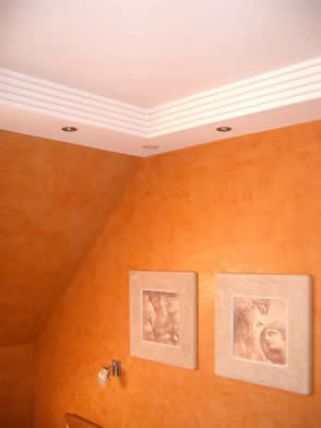 Modernes Stufengesims mit Einbauleuchten, Wand mit italienischer Spachteltechnik Detailansicht mit Gesims und Vorhangverkofferung